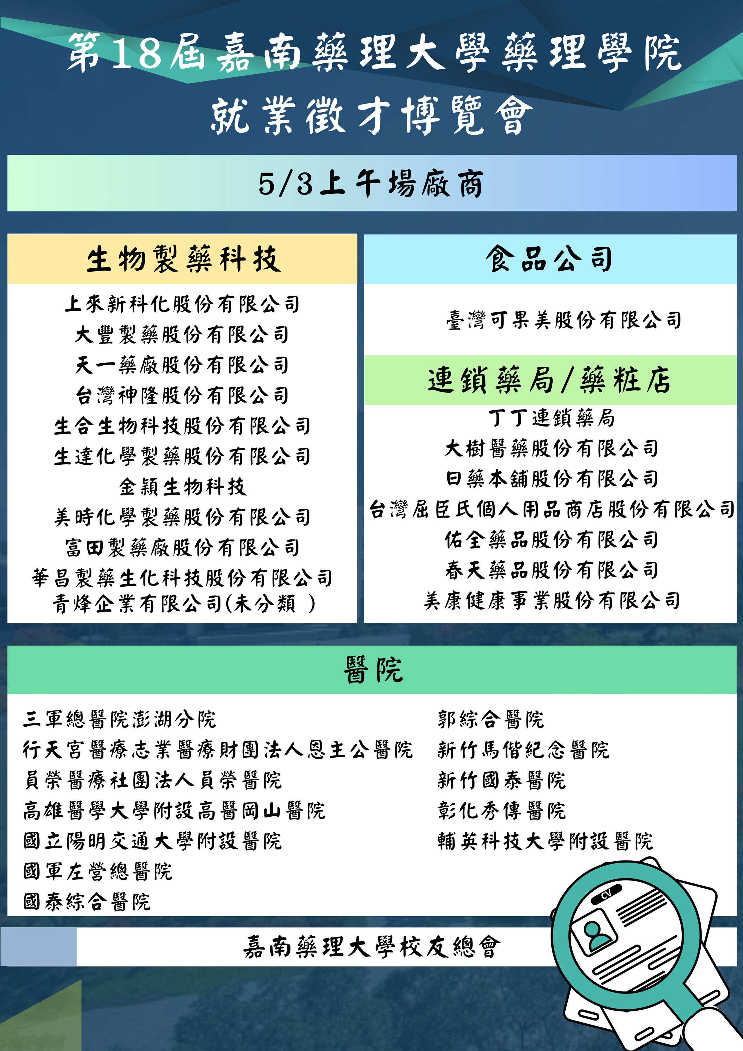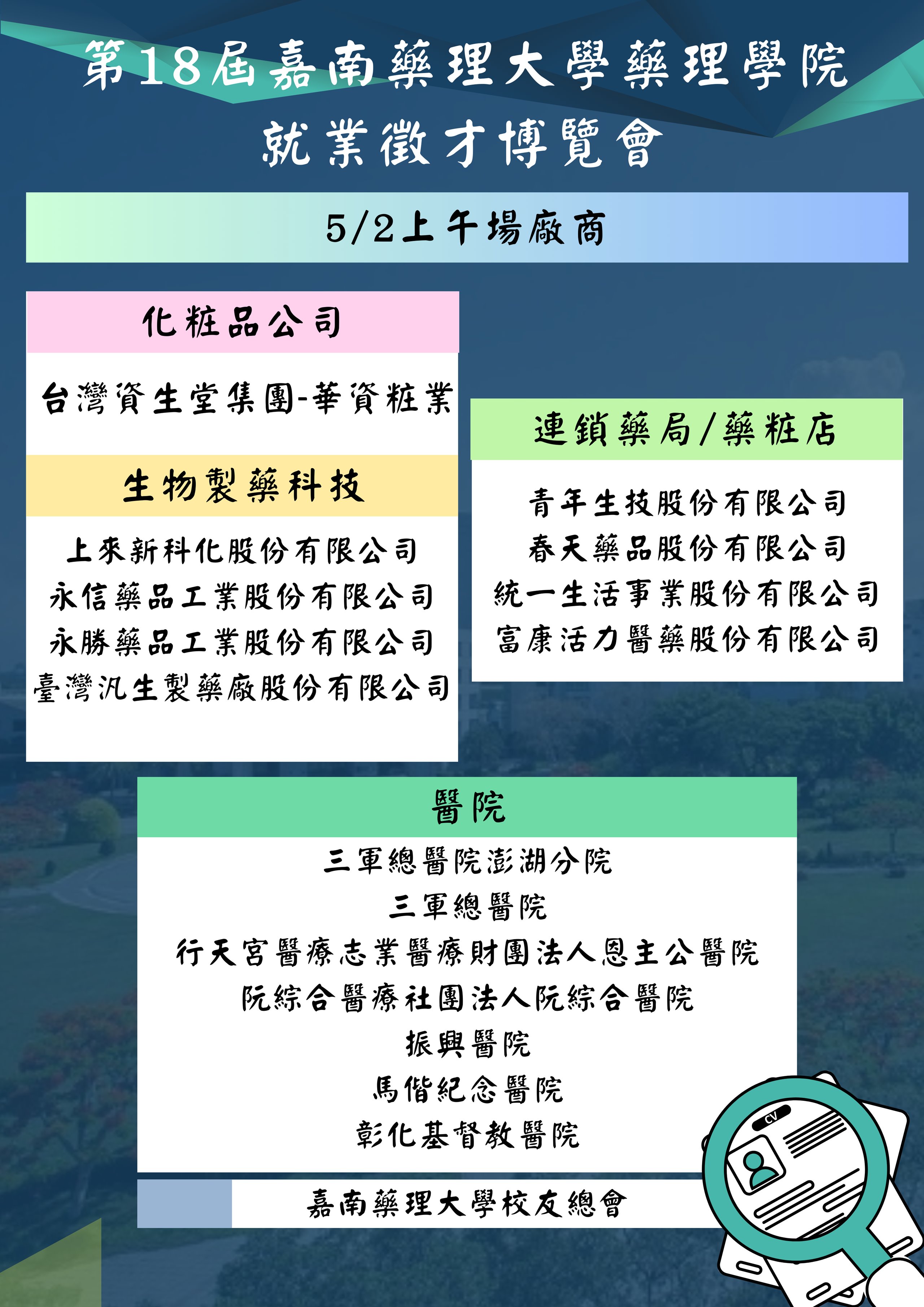 第18屆藥理學院廠商徵才博覽會參展及徵才廠商「參展資訊」,詳情請參閱以下說明與附件。